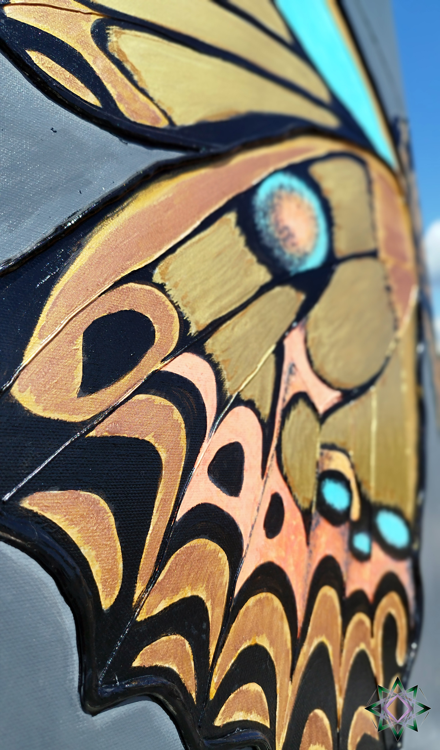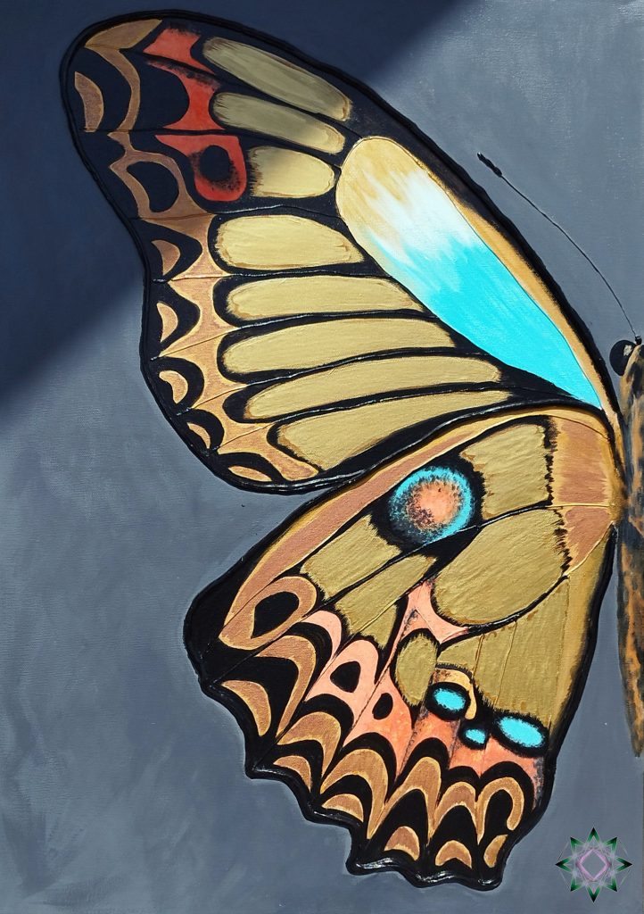 Der Königsschmetterling, bekannt für seine leuchtenden Farben und beeindruckende Flügelstruktur, ist mehr als nur ein schönes Insekt. In vielen Kulturen wird er als Symbol für Transformation und Veränderung angesehen. In meinem Bild „Königsschmetterling“ habe ich versucht, diese Symbolik einzufangen und in eine visuelle Sprache zu übersetzen. Die Verwendung von schimmernden Texturen und reflektierenden Elementen verleiht dem Bild eine Lebendigkeit, die es in jedem Raum zum Strahlen bringt.
